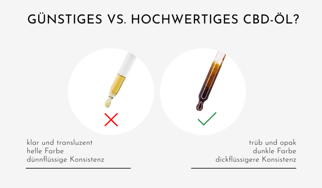 Bei vielen der auf dem Markt erhältlichen Öle wurden die ganzen Pflanzenbestandteile und Bitterstoffe herausgefiltert. Diese Öle, die meist durch Einsatz von CBD-Extrakten oder -Isolaten hergestellt werden, sind dann in der Regel klar und durchsichtig.