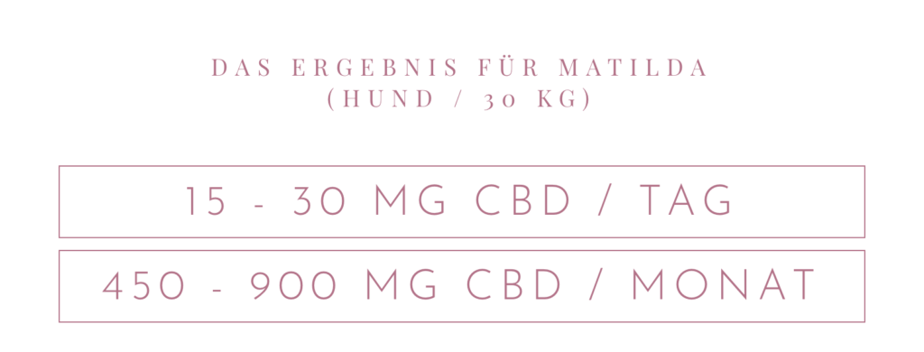 Um das ganze nun etwas besser zu veranschaulichen, gehen wir es mal am Beispiel der 30 Kilogramm schweren Weimaraner Hündin Matilda durch. Die empfohlene CBD-Tagesdosis für sie liegt zwischen 15 und 30 Milligramm CBD.