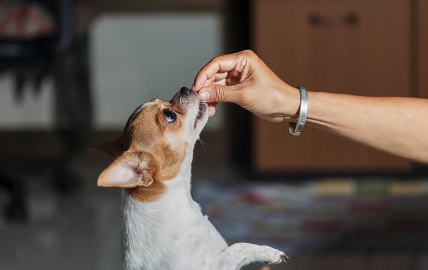- Richtige Dosierung – Zunächst ist es wichtig, auf die richtige Dosierung zu achten. Wir empfehlen, mit einer sehr niedrigen Dosis, also ca. 0,5 mg pro Kilogramm Hundegewicht zu beginnen und diese schrittweise anzupassen. Wie viel CBD dein Welpe braucht, ist individuell, denn jeder Organismus ist ein bisschen anders. Die meisten Hunde pendeln sich bei einer Tagesdosis von 0,5 bis 1 mg CBD pro Kilogramm Körpergewicht ein. Dabei sollte die Gabe über den Tag aufgeteilt werden, also zum Beispiel morgens, mittags und abends. In besonderen Stresssituationen kann gerne auch mehr gegeben werden.